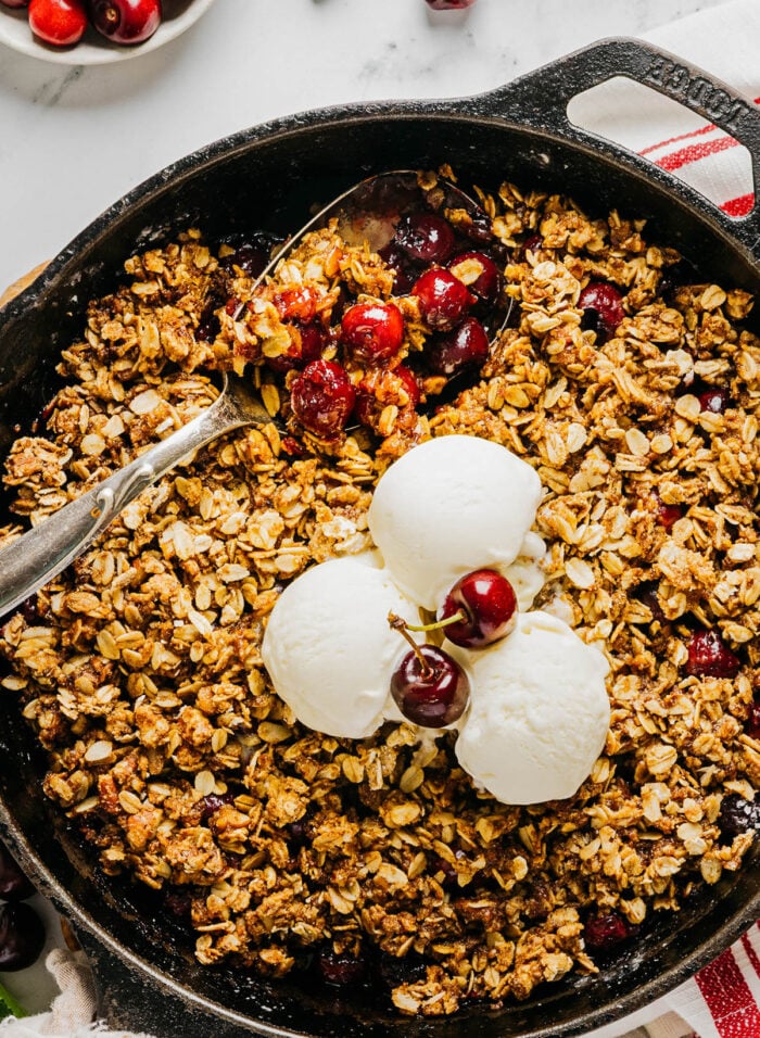 This Healthy Cherry Crisp recipe is the ultimate summer dessert! Bursting with sweet cherries and a wholesome oat topping, this warm cherry crisp easily comes together with just a few simple ingredients! It’s officially cherry season and what better way to use up all these beauties than with this Healthy Cherry Crisp recipe! Juicy cherries…