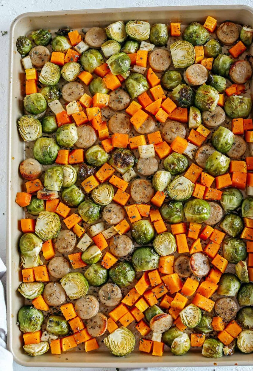Harvest Sheet Pan Sausage and Veggies loaded with flavorful chicken sausage, butternut squash, brussels sprouts, and apples for a quick and easy dinner made in just 30 minutes! Roasted in a maple mustard glaze and fresh herbs for the perfect fall meal! Want to save this recipe? Just enter your email and get it sent…